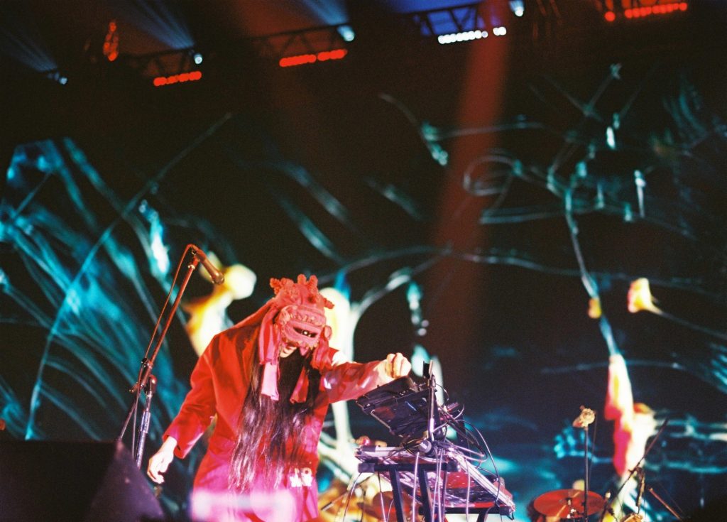 見たことのないドキュメントが続く。生バンドとサンプリングを掛け合わせた「誅犬」は原曲よりもBPMを落とし、PA内田直之によるとんでもないダブミックスが施される。止まらない呪術的ループ、儀式を思わせる赤いライト。さらには〈狂メドレー〉と題されたノンストップの展開に息を呑む。ヤクモア(ベース)はアンプの上に立ちディジュリドゥを吹きまくり、「Fight War Not Wars」の叫びは「Free Refugees」の苛烈なパーカッションと一体になって全身に突き刺さる。スクリーンに大写しになる〈NO WAR〉の文字と共に始まるのは「東京」。〈銃声が聞こえるだろう〉という歌詞が発売当時よりもリアリティを帯びているのがなんとも息苦しく、預言者、アジテイターとしてのマヒトゥ・ザ・ピーポーは、いよいよ時代に選ばれた存在感を発揮しているようだ。