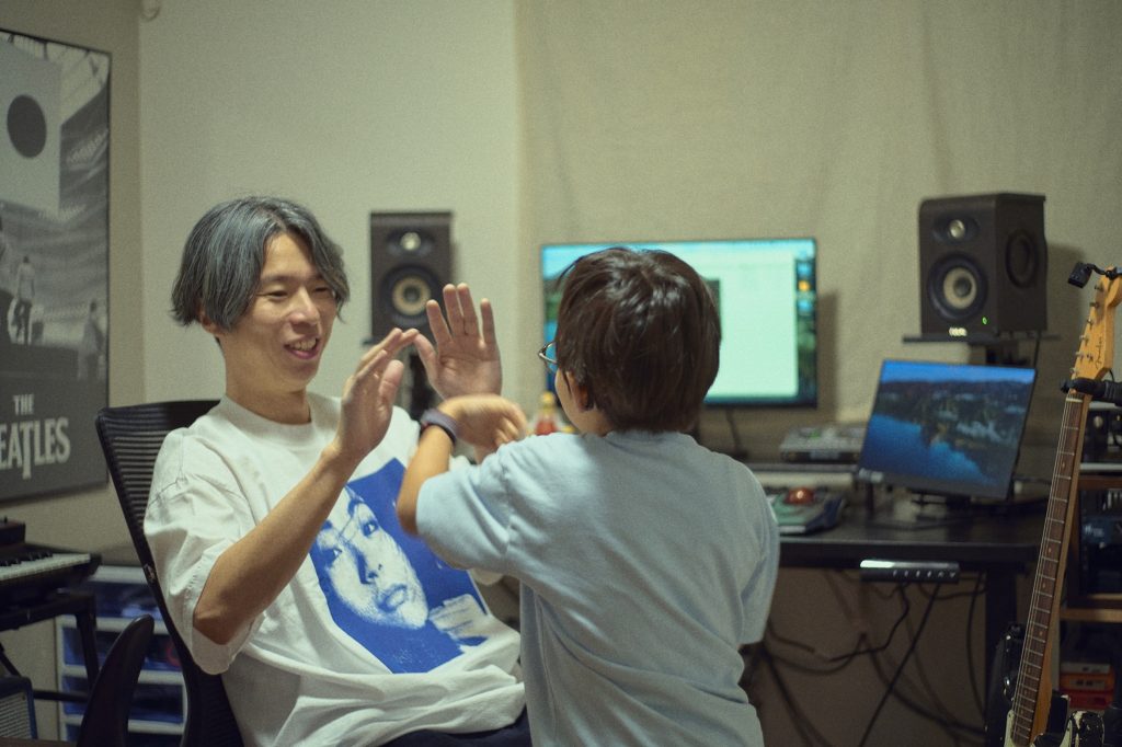 「プロデューサー目線で見ると、サウンドやメロディに対しての、やっぱり歌詞が課題……僕が書いてるんですけど(笑)。僕の中で歌詞って、絶対韻を踏まないといけなくて。内容が多少薄くなっても、押韻と脚韻を使ってちゃんと整ったものにしてるんですよ。ある人に『予測変換みたいな歌詞だな』って言われたことあるけど、それはあえてなんです。でも感情みたいなものが乗りにくいのもわかる。去年、宮崎朝子さん(SHISHAMO)と知り合って、彼女の作ってきた曲ちゃんと聴いたら、文章のような歌詞に天才的なメロディがついてて、リズムのフックもある。久々に天才を見ました。僕みたいなのは、よっぽど心を動かされることがないと筆が進まない。だから今回の曲の歌詞が夏っぽいのは、全部、旅行で行ったハワイで書いてるからです(笑)。あと自分と息子の関係で感じたことを歌詞にしてる。それが一番自分にとってはリアリティがあるから。宮崎朝子さんみたいに想像力を働かせて書くタイプじゃないし、だからといって今さら恋愛できない(笑)。それより、楽曲のリズムにフックをつけたり韻を踏むことで、完成度を上げたい。だから課題としては、楽曲のバリエーションをもう少し広げることと、歌詞かな」